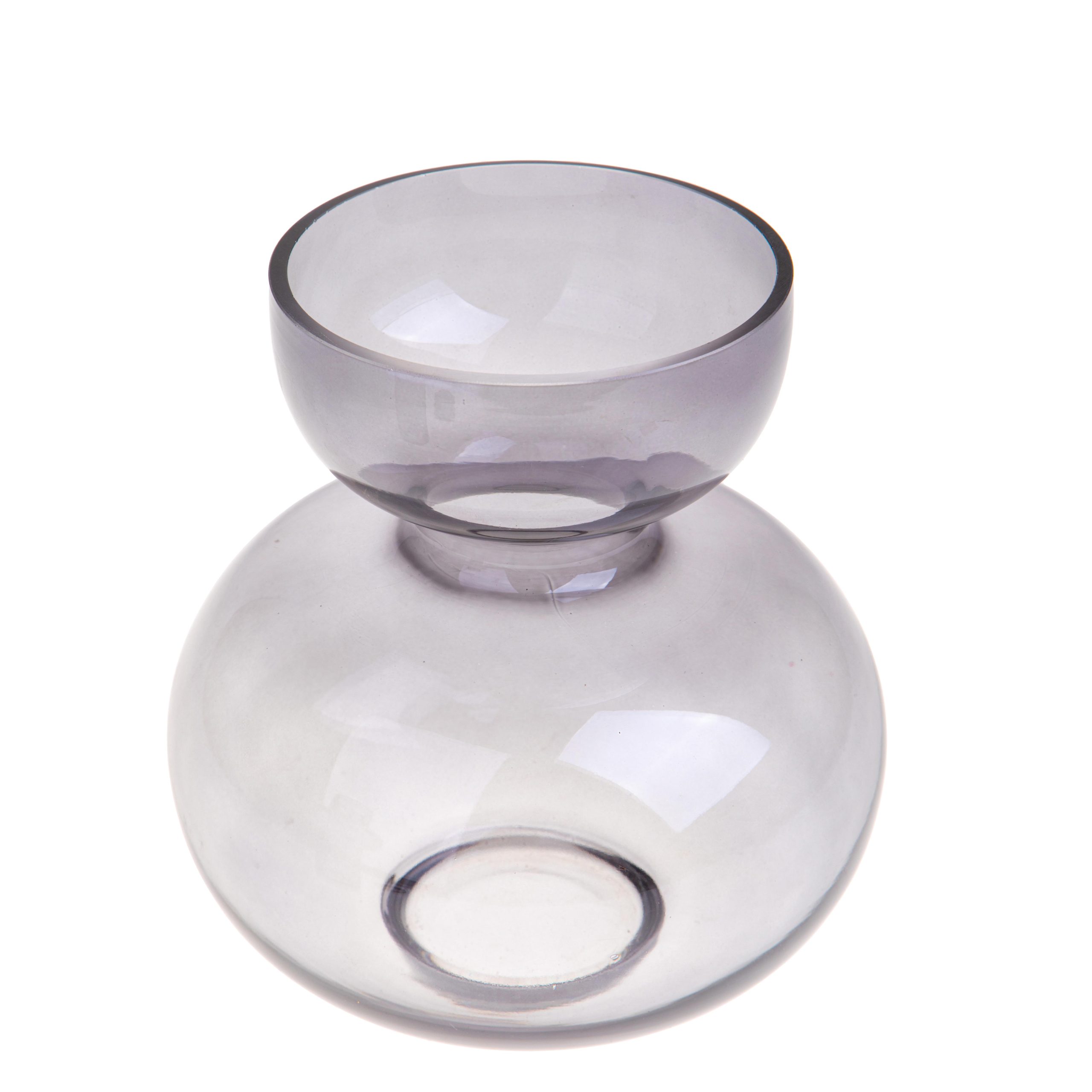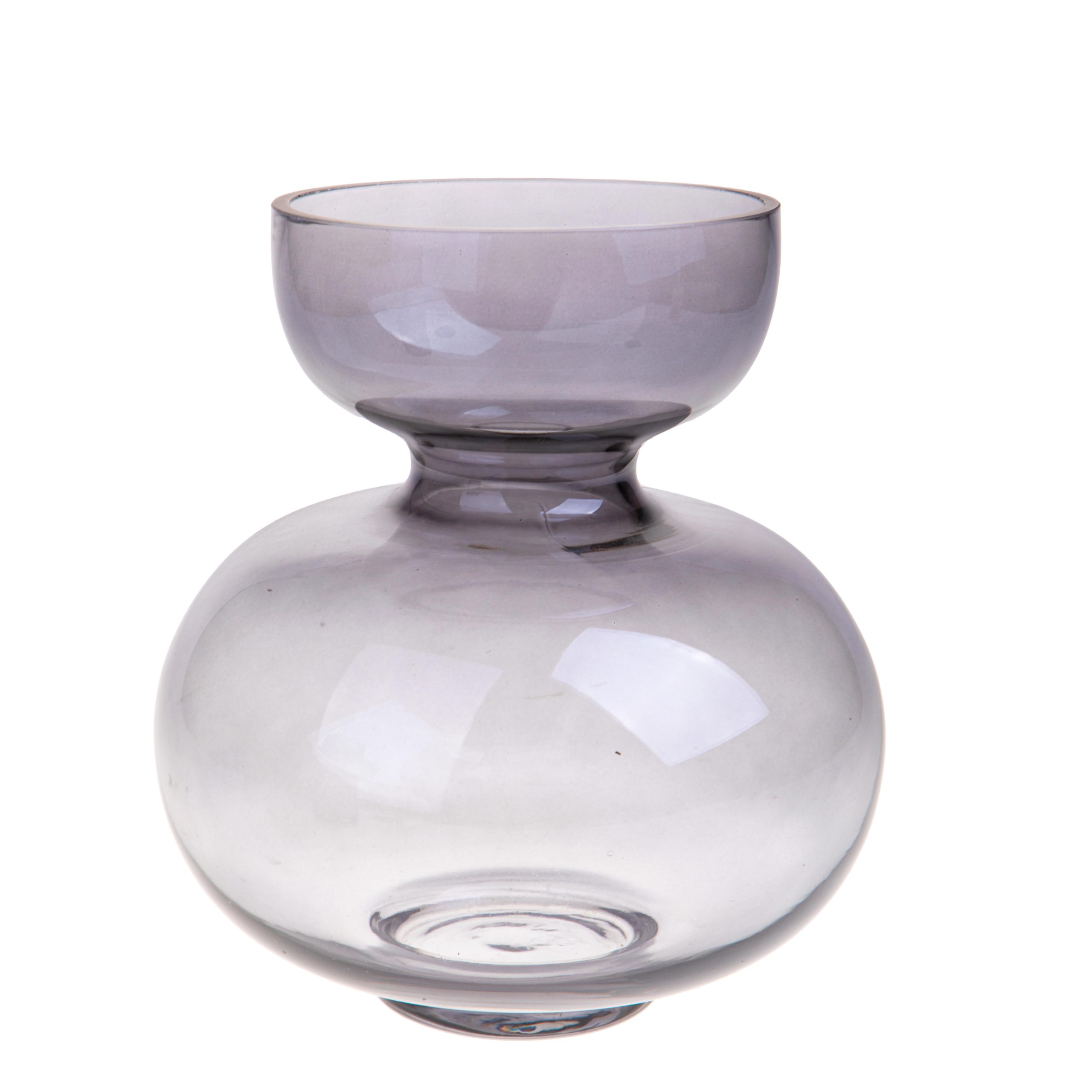Vaso decorativo in vetro grigio fumé caratterizzato da una silhouette morbida e avvolgente. La forma panciuta con collo corto lo rende un complemento d’arredo raffinato e di grande impatto visivo. Perfetto per centrotavola, mensole o credenze, aggiunge un tocco sofisticato agli spazi interni.