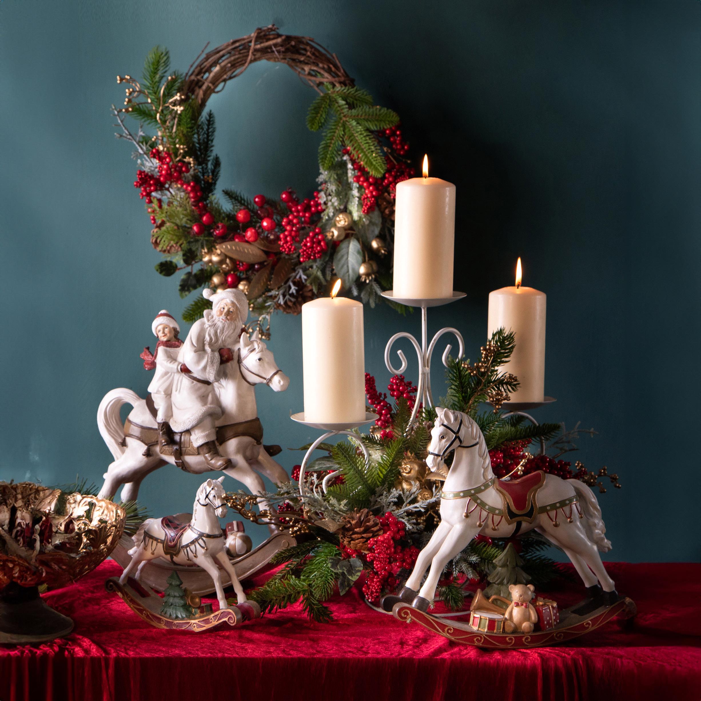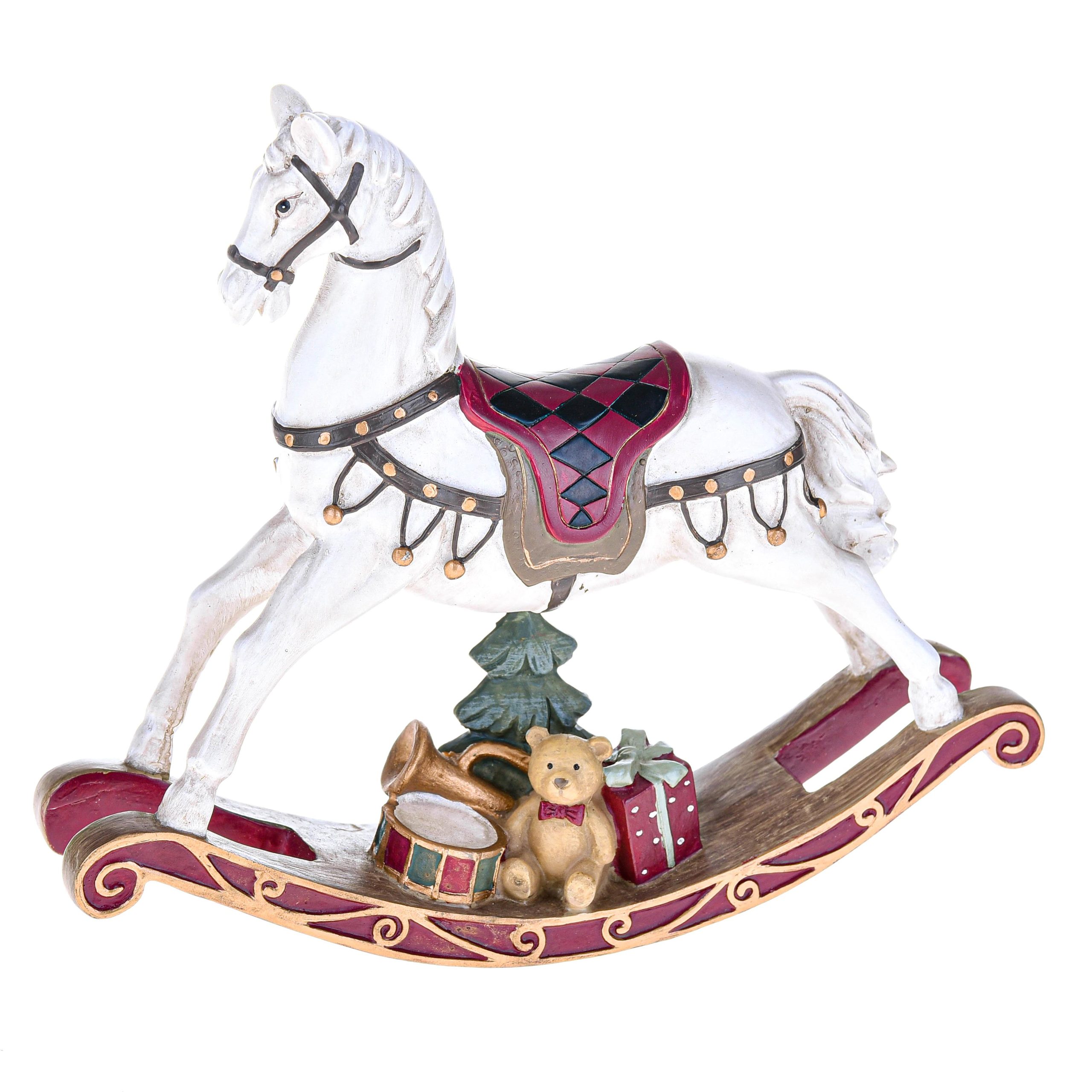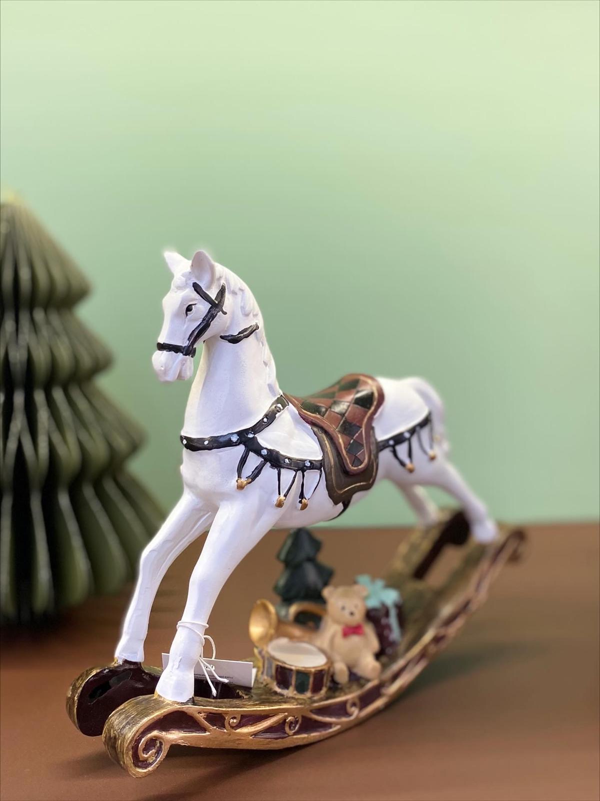 Cavallo a dondolo natalizio in resina, impreziosito da decorazioni e dettagli festivi. Un complemento d’arredo perfetto per creare un’atmosfera calda e magica durante le feste.