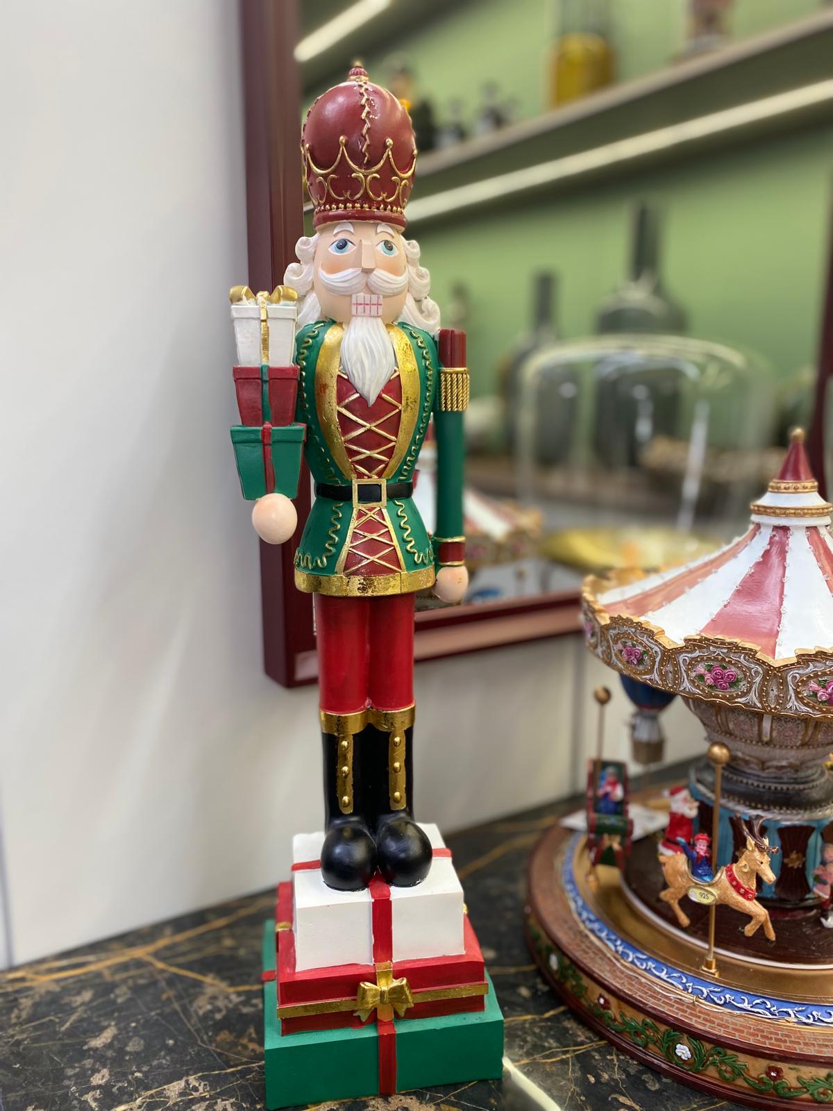 Porta un tocco di eleganza e tradizione nella tua casa con questi splendidi schiaccianoci in resina, realizzati con grande cura dei dettagli e posizionati su una base decorata con pacchi dono.